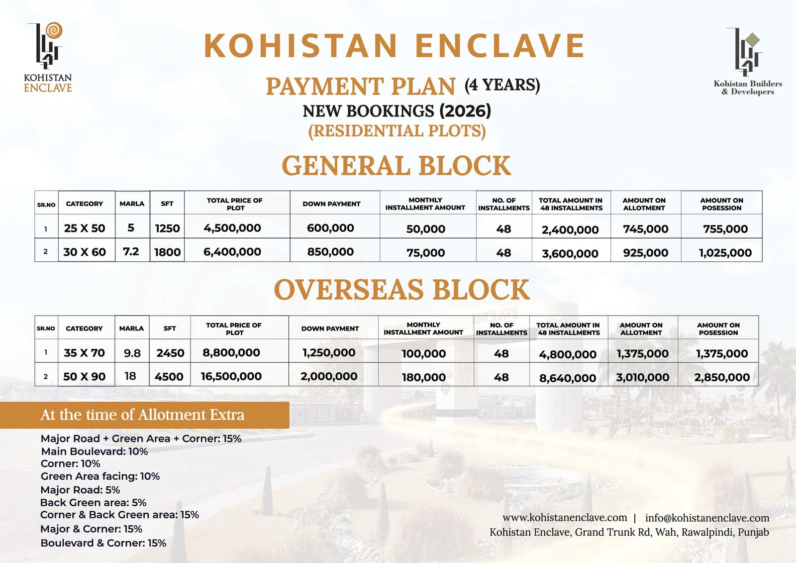 Kohistan Enclave offers flexible payment plans for 5, 7, 10 marla, and 1 kanal residential plots. Each plan is designed to accommodate a range of budgets with convenient monthly installments. At Kohistan Enclave, we provide a reliable and transparent approach to achieving your property goals.
